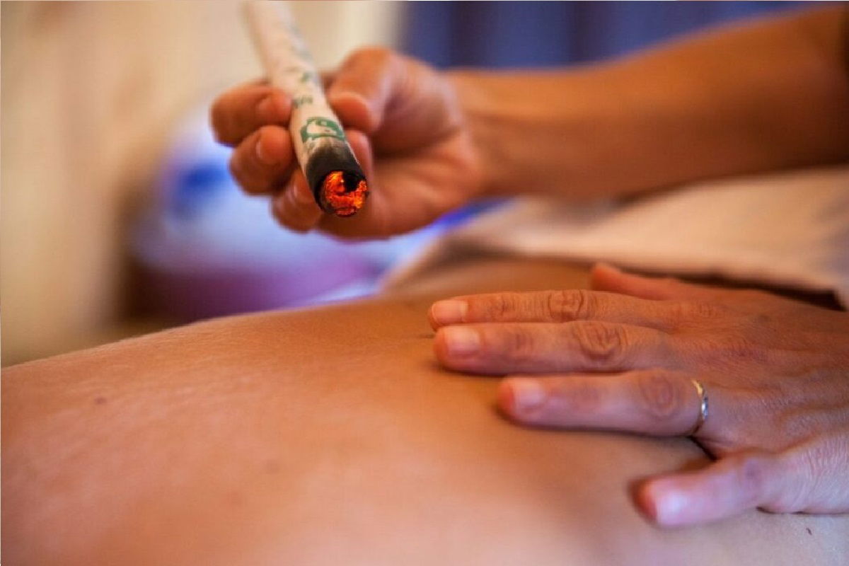 En la medicina tradicional china, es un tipo de terapia con calor que utiliza la planta de artemisa, al quemarse cerca de la piel, estimula un punto de acupuntura para calmar la dolencia afectada, sacar el frio y demás propiedades.